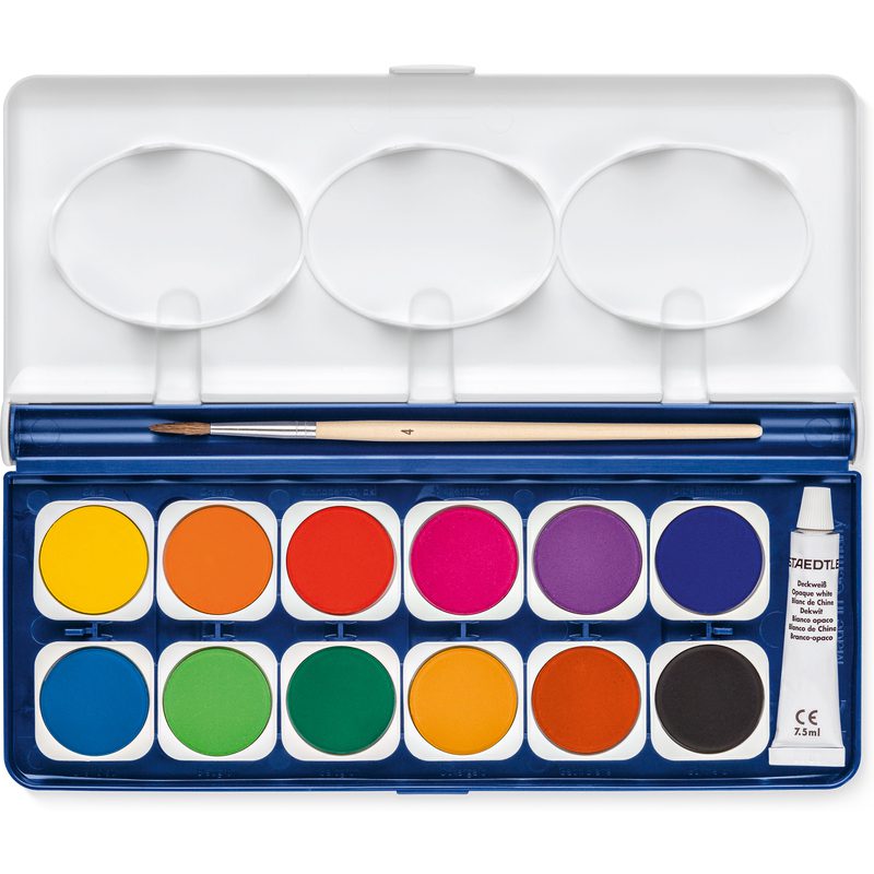 Coffret Staedtler Noris Club de 12 pastilles d’aquarelle, un tube de gouache blanche et un pinceau. Pratique de par son couvercle-palette qui peut servir pour le mélange des couleurs. Toutes les couleurs peuvent être mélangées entre elles. Couleurs brillantes avec excellent pouvoir couvrant. Boîte de 12 godets interchangeables.