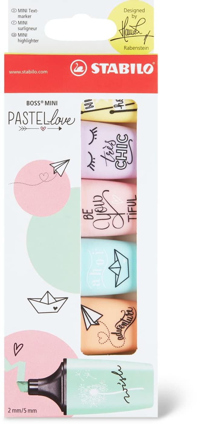 The BOSS Mini Pastellove highlighters line includes six trendy pastel colors in the mini BOSS shape. The 3-color set contains one each of lilac haze, hint of mint and creamy peach. The 6-color set contains one each of all the pastel colors (hint of mint, creamy peach, touch of turquoise, pink blush, lilac haze, and milky yellow). These little highlighters are must-haves for lovers of lettering and fans of soft colors. The fresh pastel colors are also a gentle alternative to the conventional neon shades of the BOSS family.